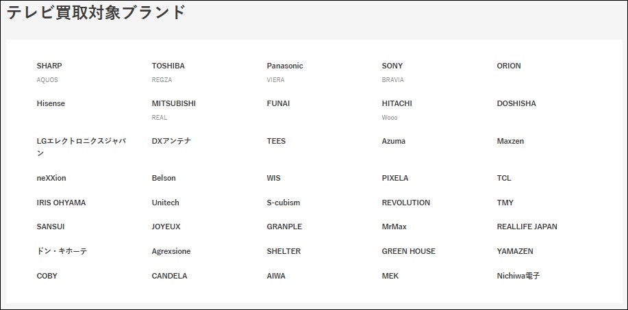 このほかにも、Hisense・FUNAI・LG・ピクセラ・ドウシシャ・ドン・キホーテPBなど、格安ブランドや海外メーカーにも対応実績があります。