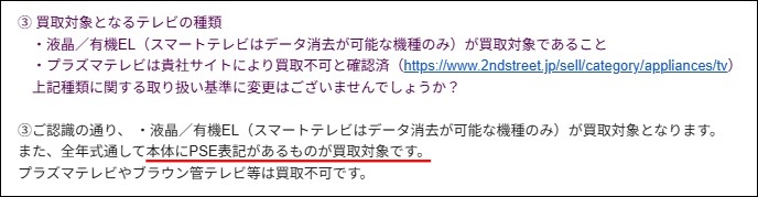 テレビ本体にPSE表記がない (※)メール回答あり |