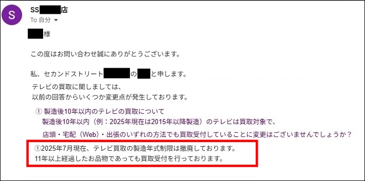 製造後10年以内(例:2025年現在は2015年以降製造)のテレビは買取受付していることに変更はございませんでしょうか?