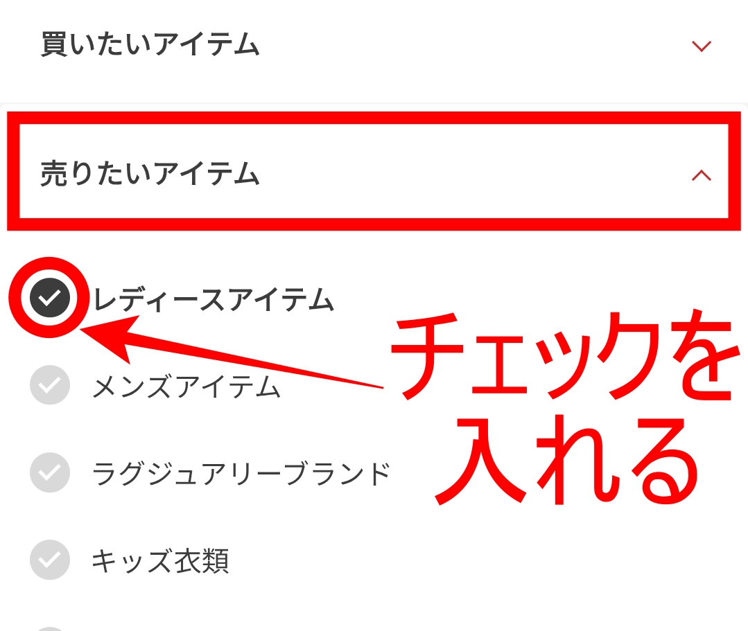 ⑤「売りたいアイテム」を押して開く➡「レディースアイテム」にチェック