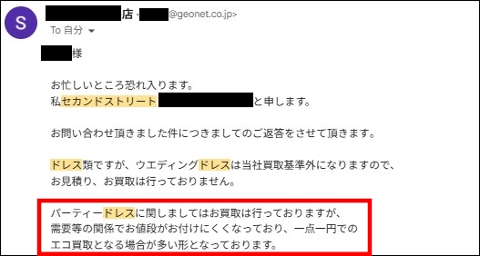調査結果どおり買取価格はかなり厳しく、結構いいお値段のパーティードレスでも数十円~数百円でしか売れないようです。