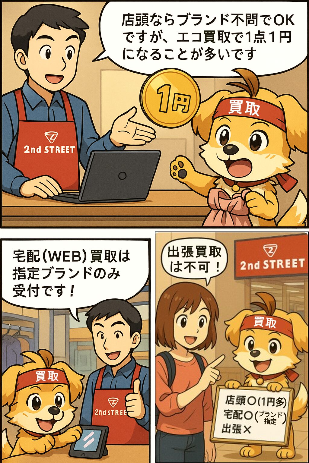 - 店頭買取では、ブランド問わず買取可能だが1点1円(エコ買取)になることが多い。