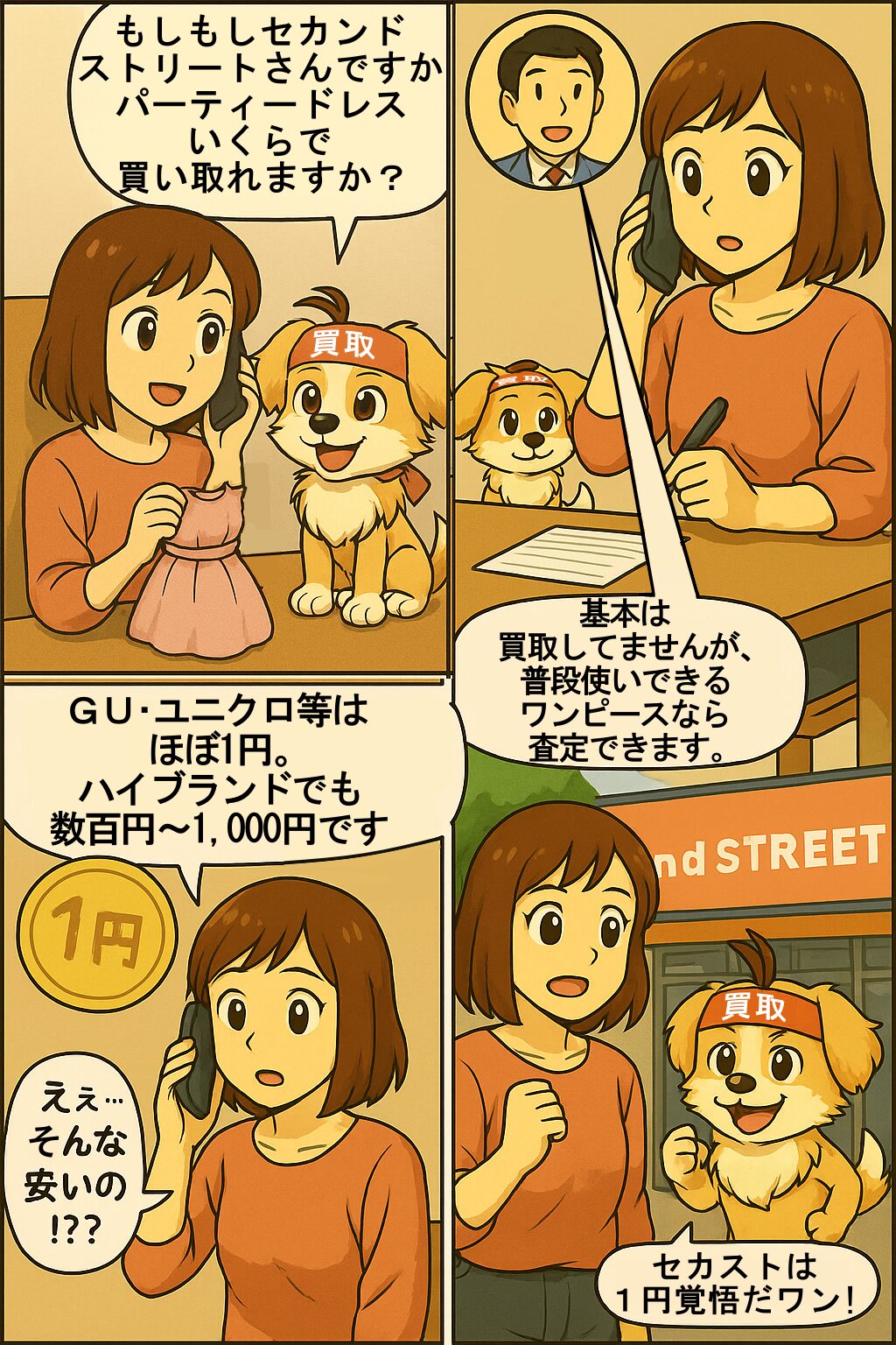 セカストに電話・メールなどで取材したところ、基本的にセカストのどの店舗でもパーティードレスとしての買取は行っていないが、「ワンピースとして普段使いできるようなデザイン」であれば、ワンピースとして買取可能とのことでした。